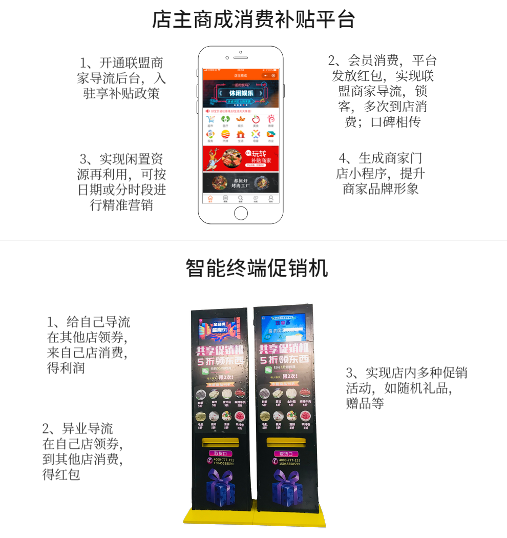 店主联盟是基于店主商成消费补贴平台由本公司自主研发的一套商家智能终端促销引流大系统,采用线上线下相结合的落地终端,以实效性帮助商家精准引流推广,做的就是帮助商家:增加客源,锁定客源。