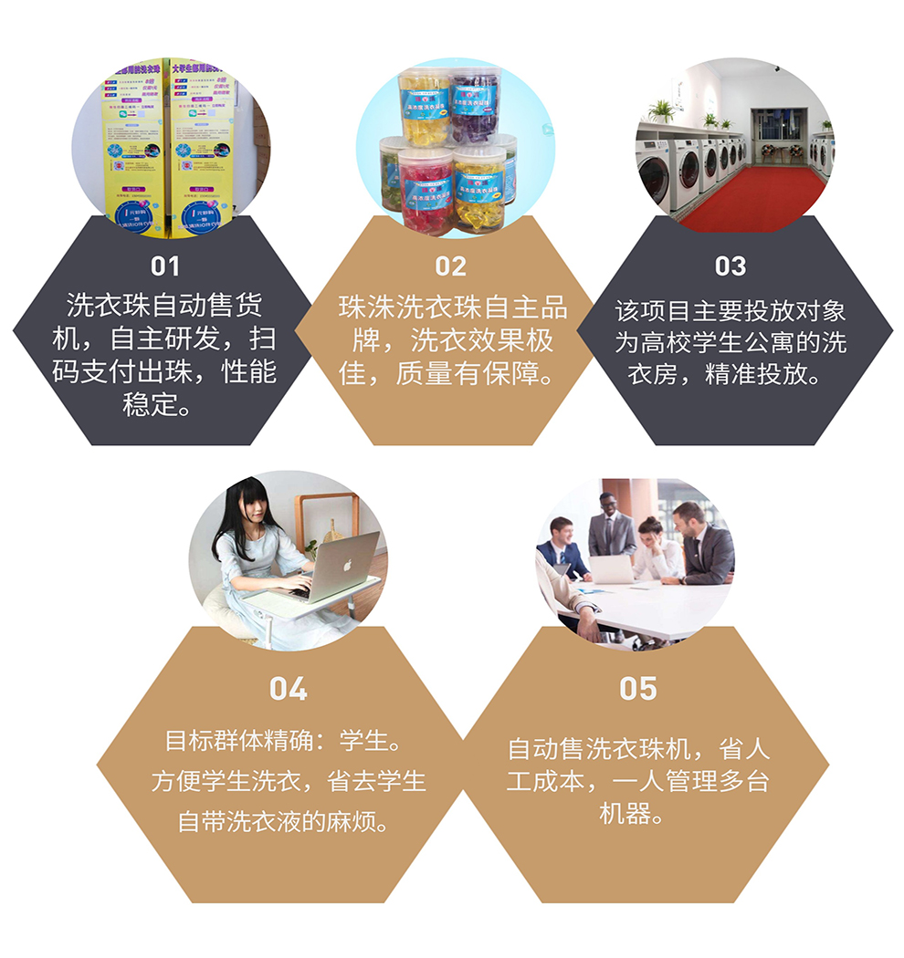 洗衣珠自动售货机,精准投放到各学生公寓洗衣房,学生洗衣时,扫码支付出珠,是方便学生洗衣的高科技项目。该项目机器由公司自主研发,具有低能耗,安全,占地面积小,环保,操作简单等优势。耗材珠洙洗衣珠是公司自主品牌,超浓缩配方,有效去污成分是品牌洗衣液的8倍,洗涤效果有保障。
